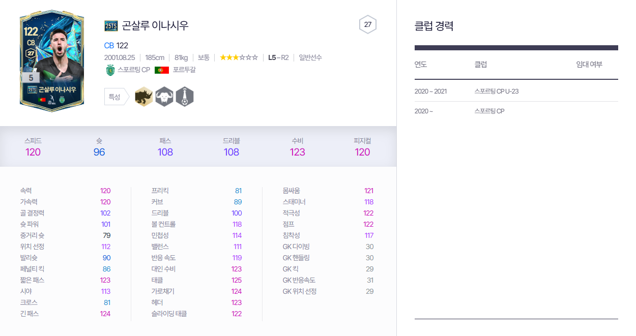 왼발 센터백이기도 하고 시원한 중장거리 패스도 가능하기에 스포르팅 or 포르투갈 유저분이라면 한번 써봐도 좋을 듯 합니다.