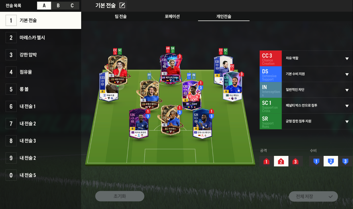 추가적으로 좌우 윙 포워드와 스트라이커의 경우 유기적으로 움직일 수 있도록 중앙을 활용한 개인전술 지정과