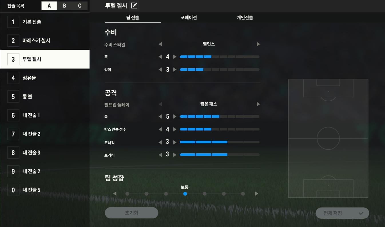 투헬의 좌우 센터백은 조금 더 전진성을 가지기 위해 참여도를 2/3으로 맞춰주시는 것이 좋습니다.