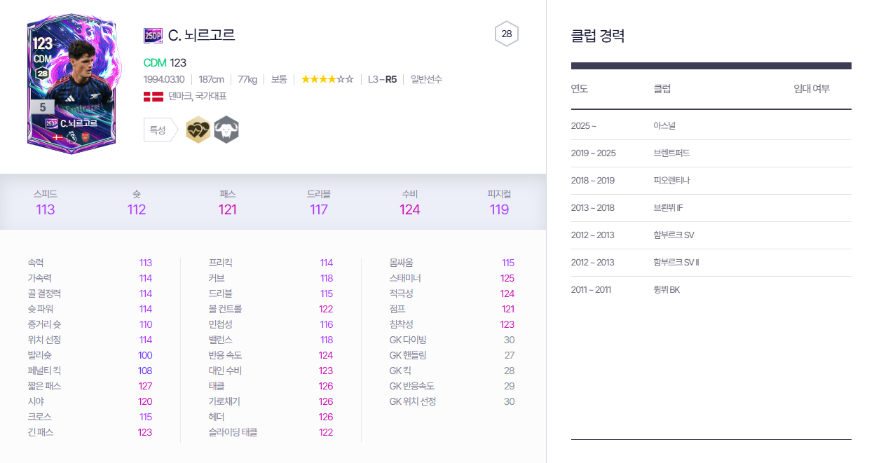 무난한 수준의 공중볼 장악 능력과 몸싸움도 나쁘지 않은 중간 수준의 느낌입니다.