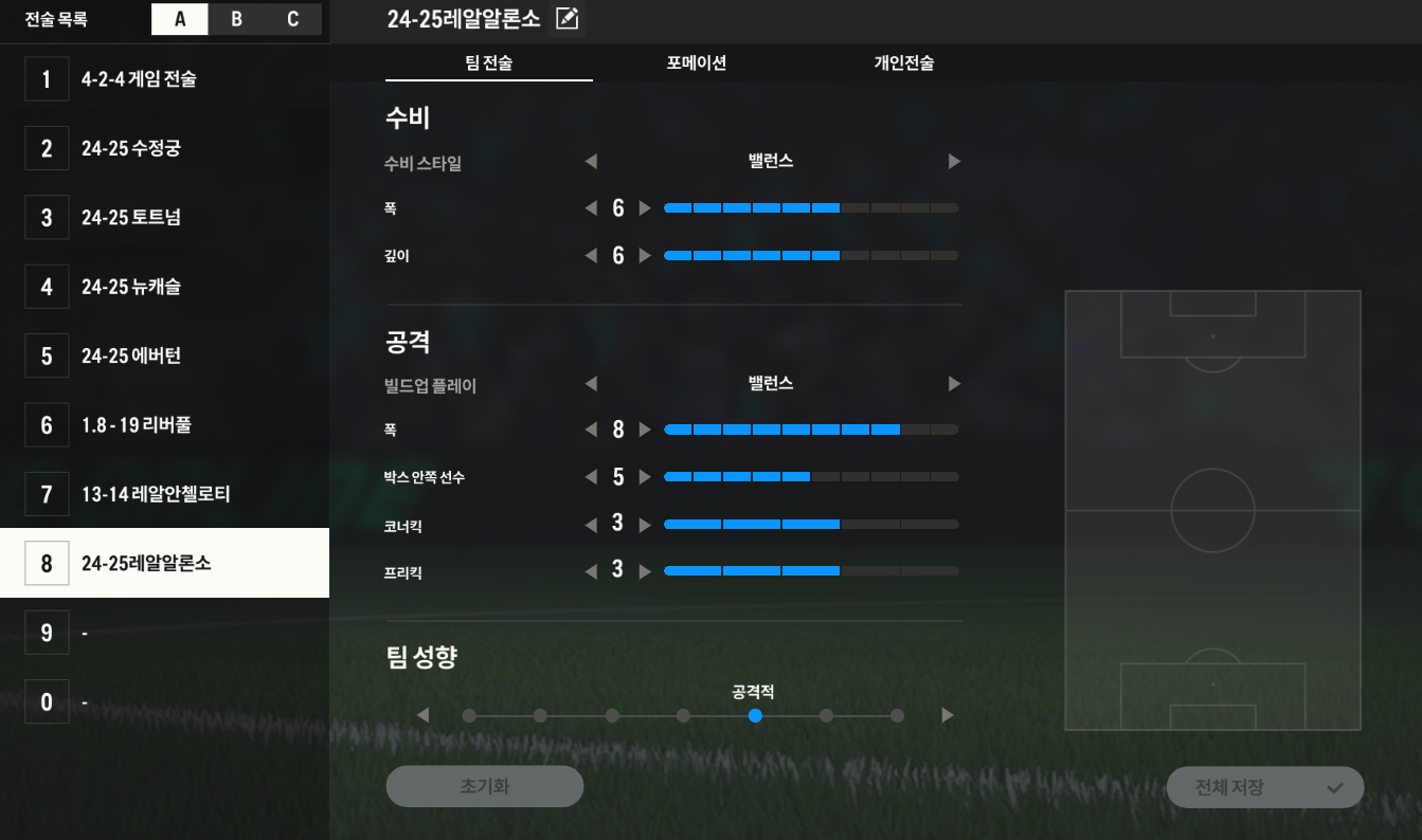왼쪽 미드필더 자리는 빌드업 과정을 거치거나 수비를 보조해줄 수 있는 움직임을 취하도록 지정해줍니다.